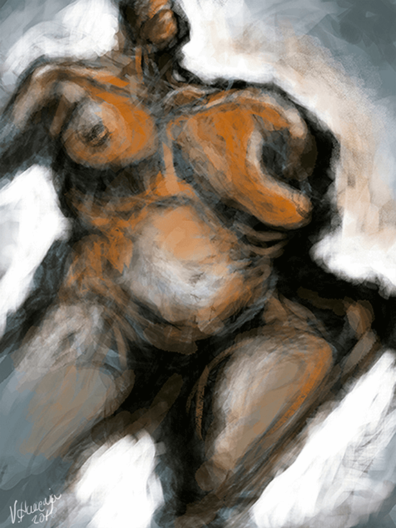 With a certain concept of a nude female’s body, I began sketching using the black color and its mid-tones. At first, I didn’t know what the results might be. Little by little, after making various “mistakes”, the body took shape. I uploaded some photos of the creative process that you can find at https://www.patreon.com/posts/never-erase-in-29637463