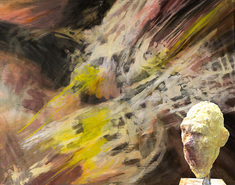 An interesting work using mixed mediums is one I recently created, Inmate No. 7, where I portray my interpretation of an inmate in two different mediums: a painting (oil and acrylic on canvas) and a physical sculpture (plasticine, clay, plaster, cement, and acrylic paint). I present these two artworks as a unit. This to provoke a speech, a certain interaction between both works.