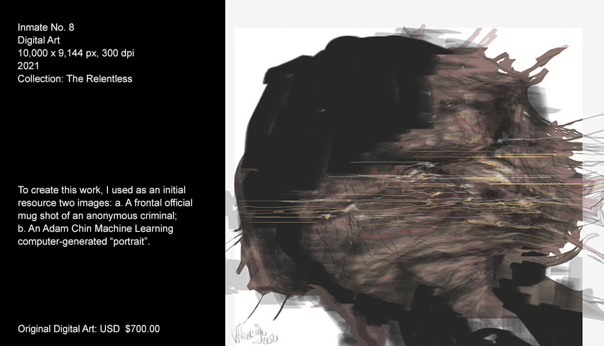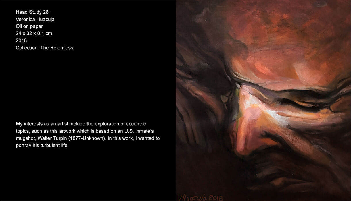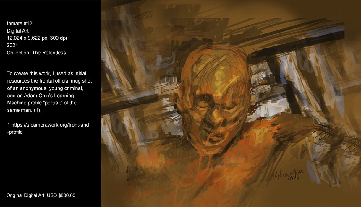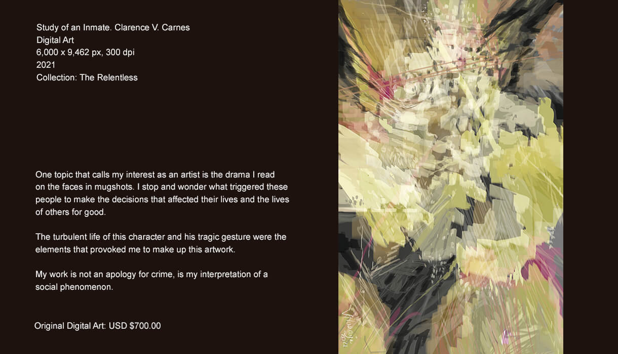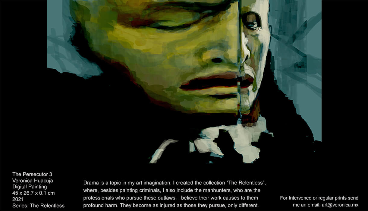 As a creator, one thing that calls my attention is the man and its precarious conditions. So, mental sickness, pathological behaviour, forensics… are some topics I explore in this series. I picture people that have social malfunctions and disorders which drive them to commit crime. The tragedy of their lives and the paths in which they have crossed in the lives of others are the impulsive elements that compel me to create this series.